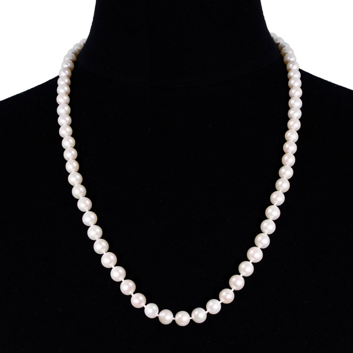 This classic hand-knotted 8mm pearl necklace is 24 inches long, with a 14 karat yellow gold fancy clasp. Necklace features AA+ quality cultured pearls.