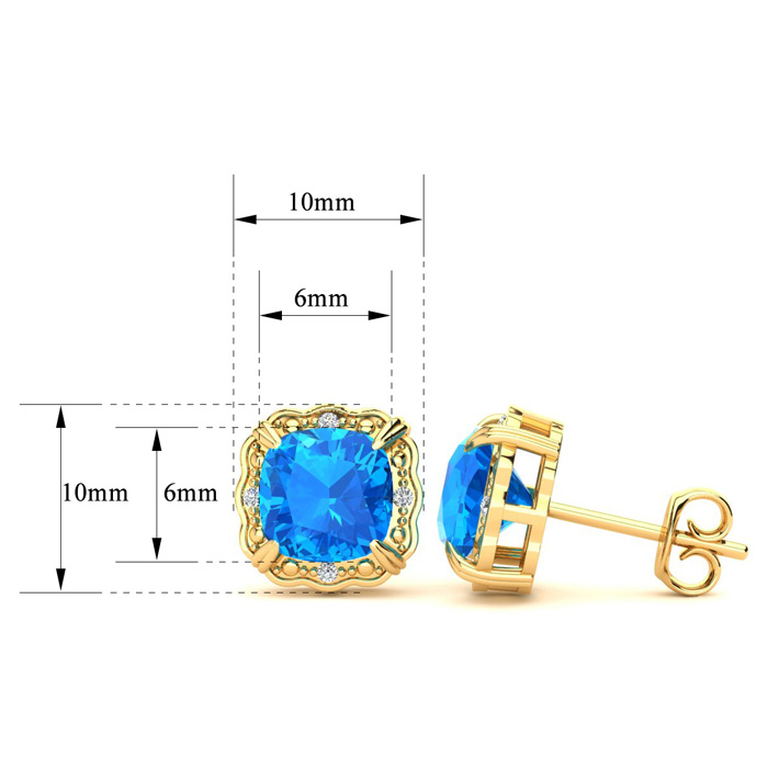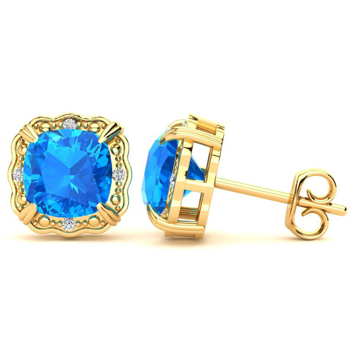 2ct Cushion Cut Blue Topaz and Diamond Earrings in 10k Yellow Gold