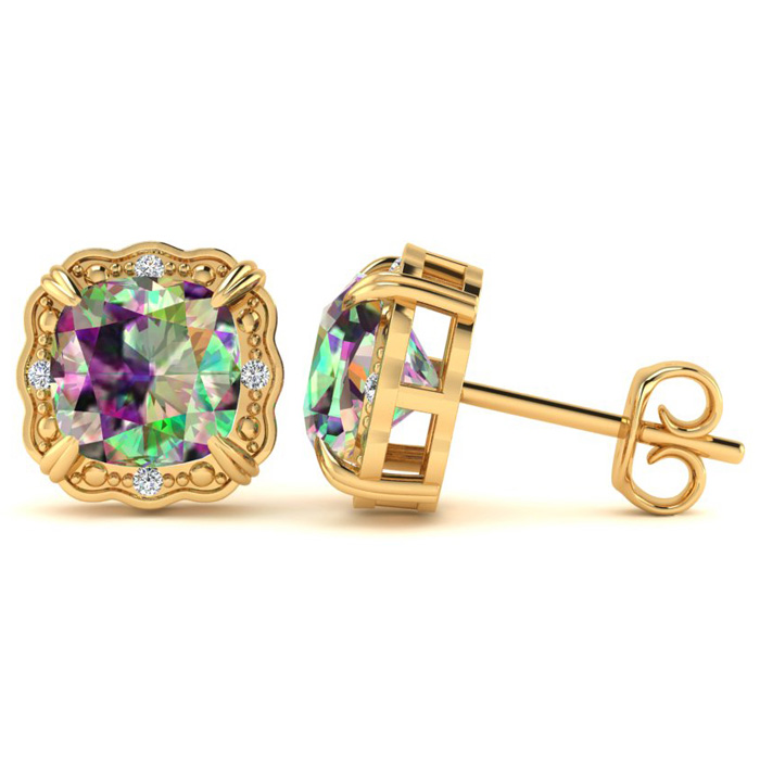 2ct Cushion Cut Mystic Topaz and Diamond Earrings in 10k Yellow Gold