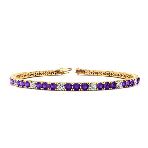 This classic gemstone bracelet features shimmering white diamonds in J-K color, I1-I2 clarity and amethyst gemstones. The 6 inch bracelet contains 57 gemstones and diamonds at 2.71 carats. The 6.5 inch bracelet contains 62 gemstones and diamonds at 2.95 carats. The 7 inch bracelet contains 67 gemstones and diamonds at 3.19 carats. The 7.5 inch bracelet contains 72 gemstones and diamonds at 3.42 carats. The 8 inch bracelet contains 76 gemstones and diamonds at 3.61 carats. The 8.5 inch bracelet contains 81 gemstones and diamonds at 3.85 carats. The 9 inch bracelet contains 86 gemstones and diamonds at 4.09 carats. This bracelet is approximately 2.25mm wide and is crafted in 14 karat yellow gold. This bracelet has a secure, box with tongue and safety clasp.