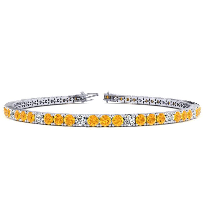 This classic gemstone bracelet features shimmering white diamonds in J-K color, I1-I2 clarity and citrine gemstones. The 6 inch bracelet contains 50 gemstones and diamonds at 3.48 carats. The 6.5 inch bracelet contains 55 gemstones and diamonds at 3.60 carats. The 7 inch bracelet contains 59 gemstones and diamonds at 3.90 carats. The 7.5 inch bracelet contains 63 gemstones and diamonds at 4.20 carats. The 8 inch bracelet contains 67 gemstones and diamonds at 4.44 carats. The 8.5 inch bracelet contains 72 gemstones and diamonds at 4.74 carats. The 9 inch bracelet contains 76 gemstones and diamonds at 5.04 carats. This bracelet is approximately 2.5mm wide and is crafted in 14 karat white gold. This bracelet has a secure, box with tongue and safety clasp.