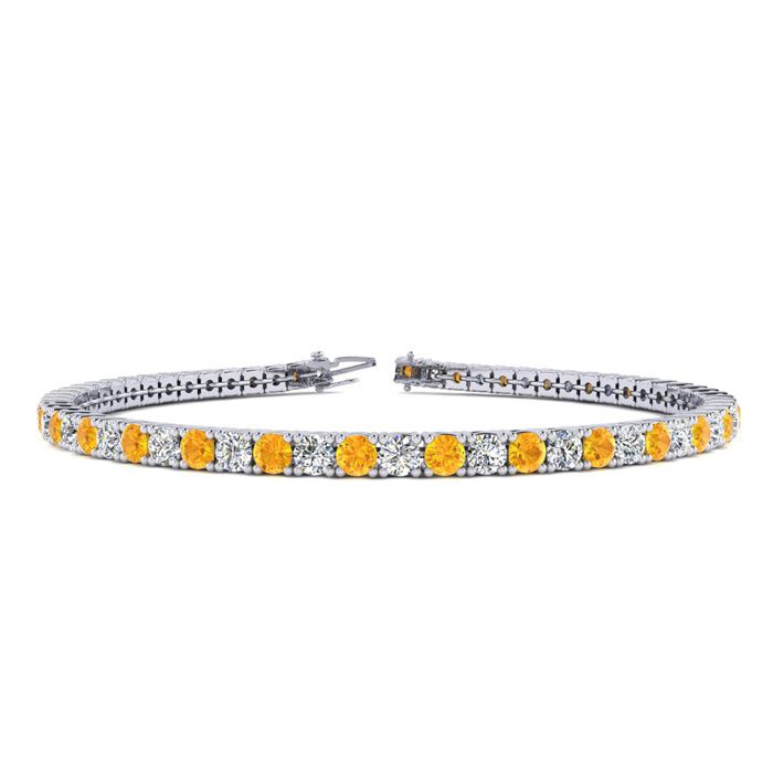 This classic gemstone bracelet features shimmering white diamonds in J-K color, I1-I2 clarity and citrine gemstones. The 6 inch bracelet contains 57 gemstones and diamonds at 2.56 carats. The 6.5 inch bracelet contains 62 gemstones and diamonds at 2.79 carats. The 7 inch bracelet contains 67 gemstones and diamonds at 3.01 carats. The 7.5 inch bracelet contains 72 gemstones and diamonds at 3.24 carats. The 8 inch bracelet contains 76 gemstones and diamonds at 3.42 carats. The 8.5 inch bracelet contains 81 gemstones and diamonds at 3.64 carats. The 9 inch bracelet contains 86 gemstones and diamonds at 3.87 carats. This bracelet is approximately 2.25mm wide and is crafted in 14 karat white gold. This bracelet has a secure, box with tongue and safety clasp.