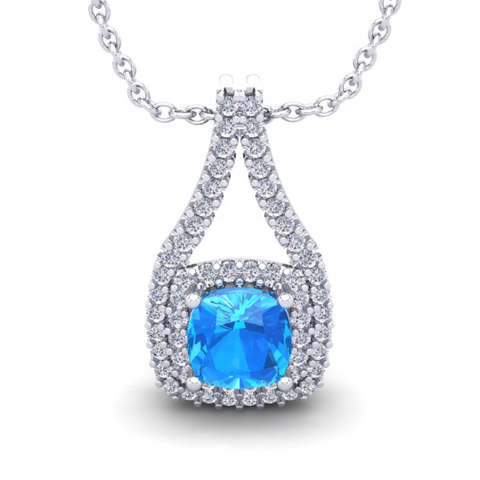 This stunning gemstone and halo diamond necklace features one 8x8mm cushion cut blue topaz gemstone at 2.70 carats. It is surrounded by 58 sparkling diamonds in a halo in I-J color, SI2-I1 clarity at 0.73 carats. Total gem weight is 3.43 carats. This necklace is crafted in 14 karat white gold and comes with an 18 inch cable chain with spring-ring clasp.