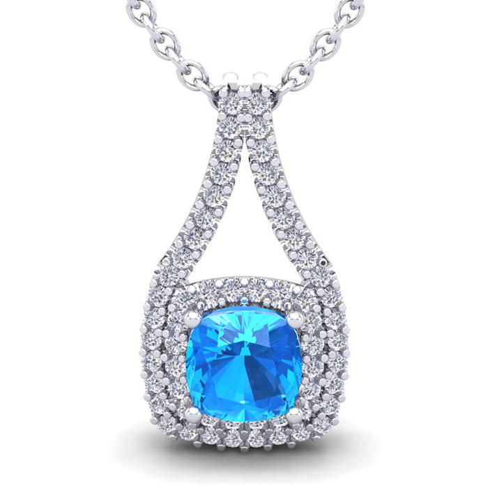 This stunning gemstone and halo diamond necklace features one 8x8mm cushion cut blue topaz gemstone at 2.70 carats. It is surrounded by 58 sparkling diamonds in a halo in I-J color, SI2-I1 clarity at 0.73 carats. Total gem weight is 3.43 carats. This necklace is crafted in 14 karat white gold and comes with an 18 inch cable chain with spring-ring clasp.