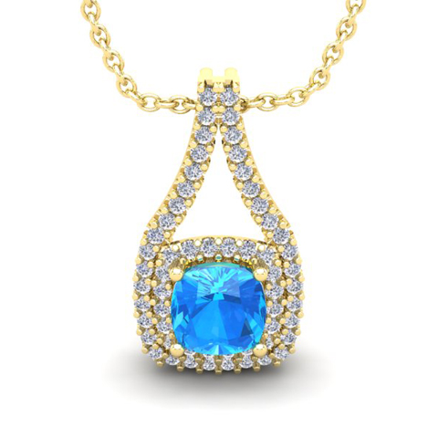 This stunning gemstone and halo diamond necklace features one 8x8mm cushion cut blue topaz gemstone at 2.70 carats. It is surrounded by 58 sparkling diamonds in a halo in I-J color, SI2-I1 clarity at 0.73 carats. Total gem weight is 3.43 carats. This necklace is crafted in 14 karat yellow gold and comes with an 18 inch cable chain with spring-ring clasp.
