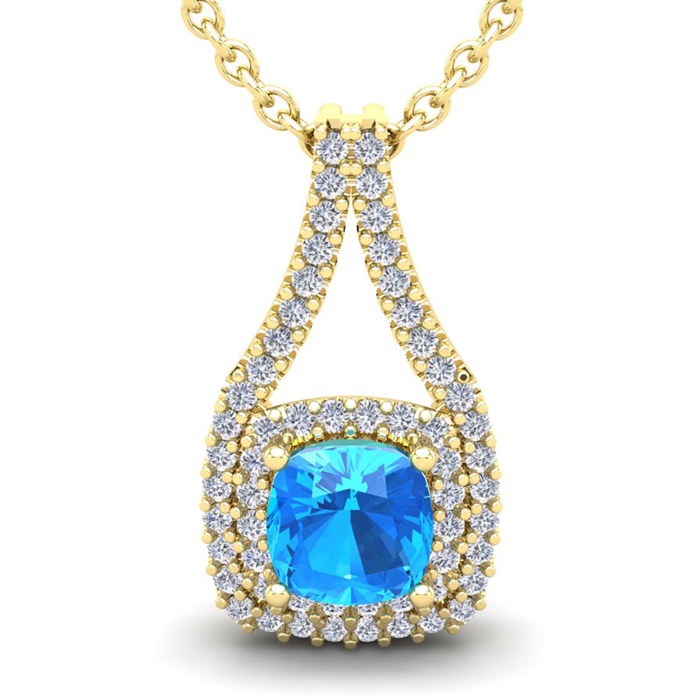 This stunning gemstone and halo diamond necklace features one 8x8mm cushion cut blue topaz gemstone at 2.70 carats. It is surrounded by 58 sparkling diamonds in a halo in I-J color, SI2-I1 clarity at 0.73 carats. Total gem weight is 3.43 carats. This necklace is crafted in 14 karat yellow gold and comes with an 18 inch cable chain with spring-ring clasp.