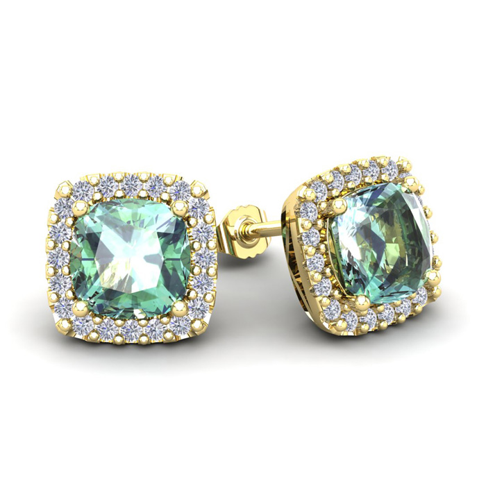 These stunning gemstone and halo diamond earrings feature two 7x7mm cushion cut green amethyst gemstones at 2.64 carats. The gemstones are surrounded by 40 sparkling diamonds in a halo in I-J color, SI2-I1 clarity at 0.40 carats. Total gem weight is 3.04 carats. These earrings are crafted in 14 karat yellow gold and come with comfortable and secure post with friction backs.