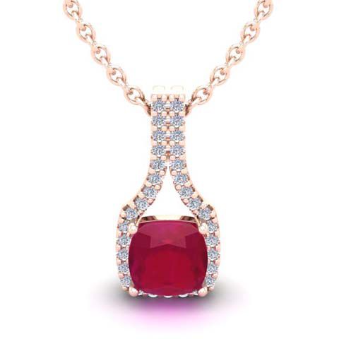 This stunning gemstone and halo diamond necklace features one 8x8mm cushion cut ruby gemstone at 3.10 carats. It is surrounded by 33 sparkling diamonds in a halo in I-J color, SI2-I1 clarity at 0.41 carats. Total gem weight is 3.51 carats. This necklace is crafted in 14 karat white gold and comes with an 18 inch cable chain with spring-ring clasp.
