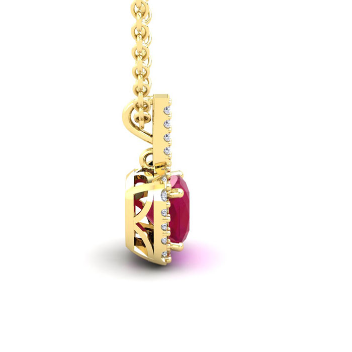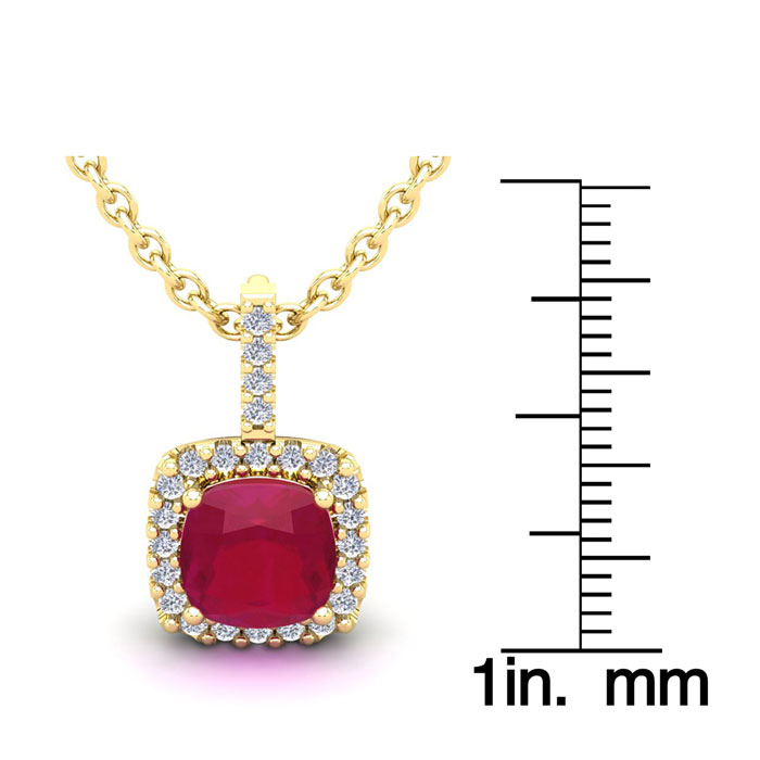 This stunning gemstone and halo diamond necklace features one 8x8mm cushion cut ruby gemstone at 3.10 carats. It is surrounded by 24 sparkling diamonds in a halo in I-J color, SI2-I1 clarity at 0.30 carats. Total gem weight is 3.40 carats. This necklace is crafted in 14 karat yellow gold and comes with an 18 inch cable chain with spring-ring clasp.