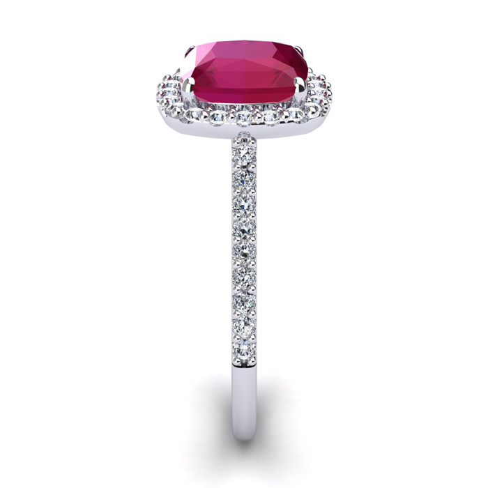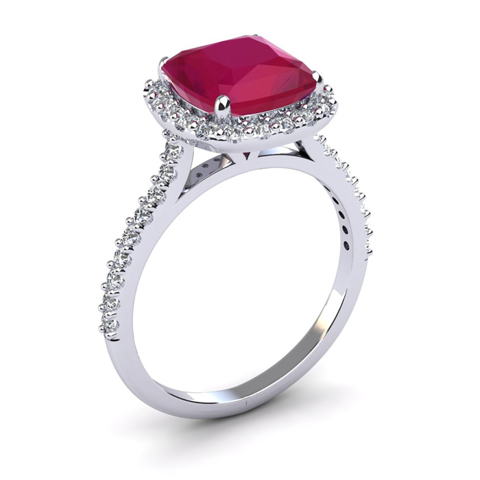 This stunning gemstone and halo diamond ring features one 8x8mm cushion cut ruby gemstone at 3.10 carats. It is surrounded by 38 sparkling diamonds in a halo in I-J color, I1-I2 clarity at 0.48 carats. Total gem weight is 3.58 carats. This ring is crafted in 14 karat white gold.