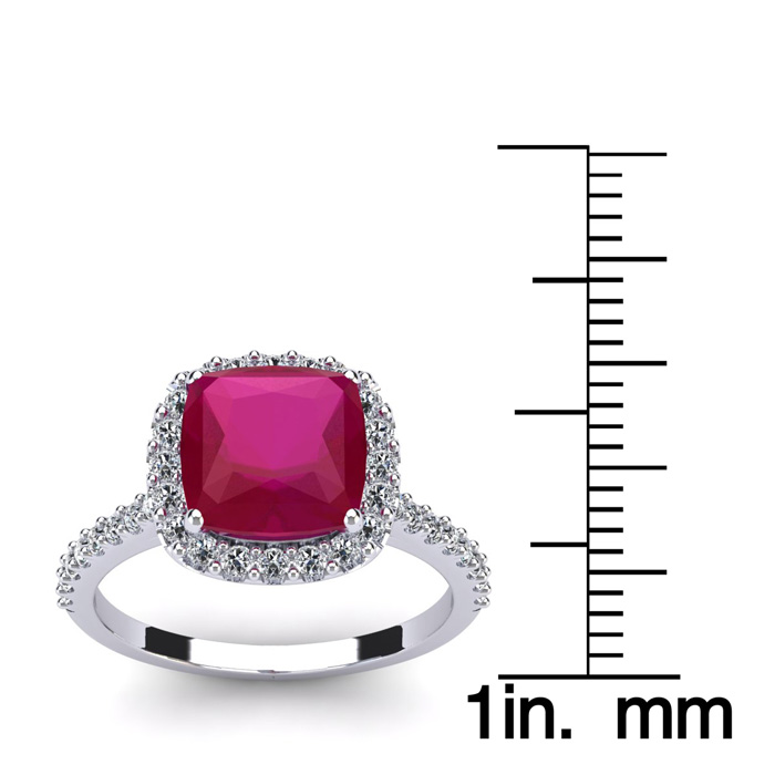This stunning gemstone and halo diamond ring features one 8x8mm cushion cut ruby gemstone at 3.10 carats. It is surrounded by 38 sparkling diamonds in a halo in I-J color, I1-I2 clarity at 0.48 carats. Total gem weight is 3.58 carats. This ring is crafted in 14 karat white gold.