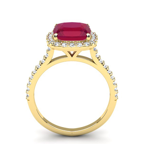 3 1/2 Carat Cushion Cut Ruby and Halo Diamond Ring In 14K Yellow Gold