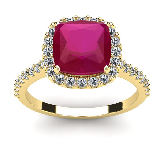 This stunning gemstone and halo diamond ring features one 8x8mm cushion cut ruby gemstone at 3.10 carats. It is surrounded by 38 sparkling diamonds in a halo in I-J color, I1-I2 clarity at 0.48 carats. Total gem weight is 3.58 carats. This ring is crafted in 14 karat yellow gold.