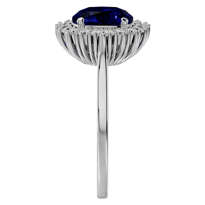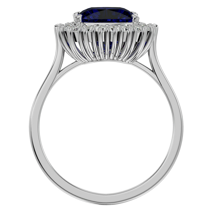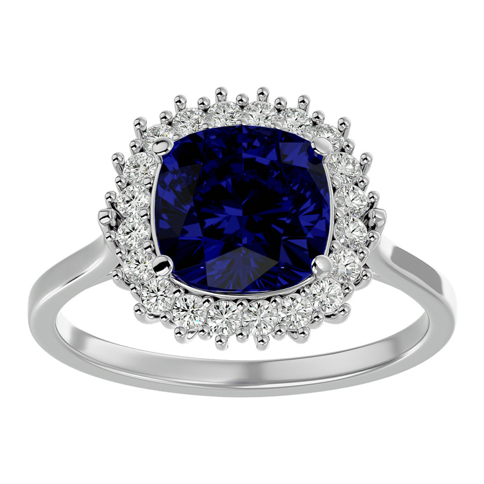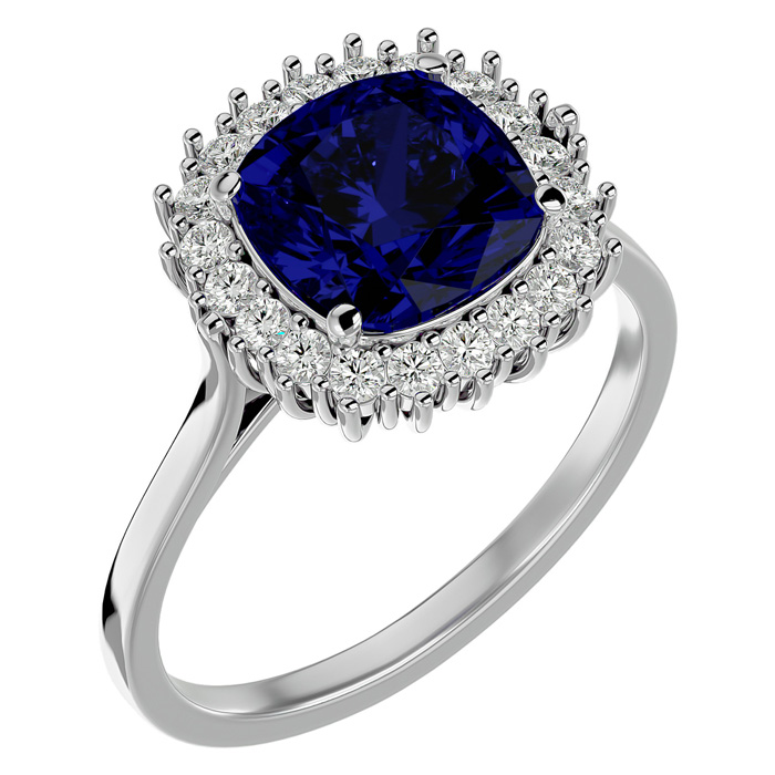 Retrograde Birthstones™ 3 1/2 Carat Cushion Cut Sapphire and Halo Diamond Ring In 14K White Gold
