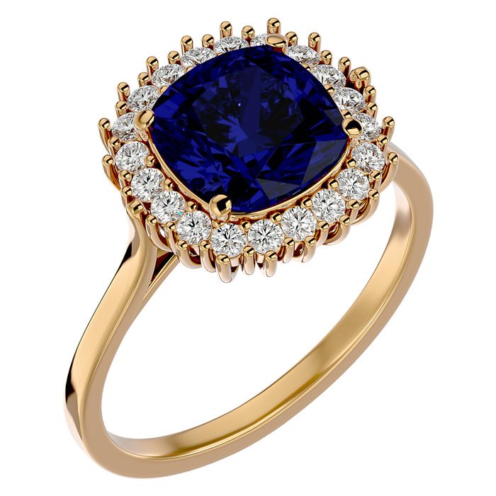 3 1/2 Carat Cushion Cut Sapphire and Halo Diamond Ring In 14K Yellow Gold