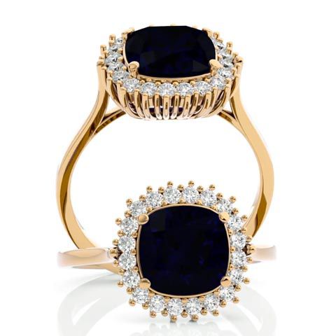 3 1/2 Carat Cushion Cut Sapphire and Halo Diamond Ring In 14K Yellow Gold