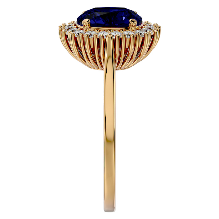 Retrograde Birthstones™ 3 1/2 Carat Cushion Cut Sapphire and Halo Diamond Ring In 14K Yellow Gold