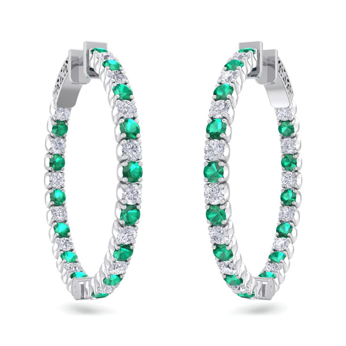These classic hoop earrings feature 30 sparkling diamonds in J-K color, I2-I3 clarity and 30 emerald gemstones. Total carat weight is 3 1/2 carats. These earrings are in 14 karat white gold and have secure hidden snap backs. These earrings are 1 inch in diameter.