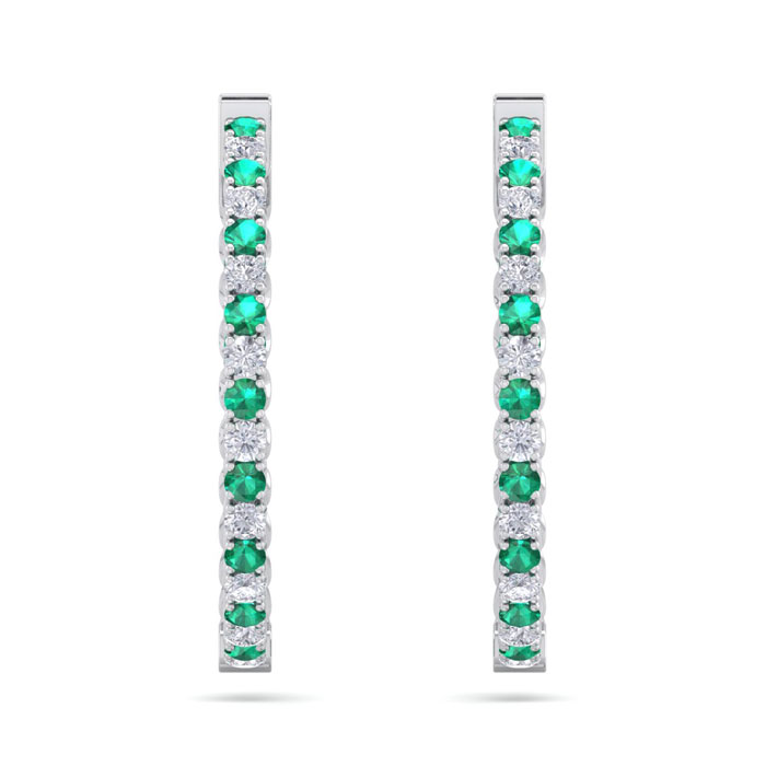 3 1/2 Carat Emerald and Diamond Hoop Earrings In 14 Karat White Gold, 1 Inch