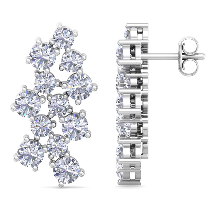 These lab grown diamond earrings feature 24 sparkling round shape lab grown diamonds totaling 3 1/2 carats. Diamond color is G-H, diamond clarity VS. These earrings are in 14 karat white gold and have comfortable and secure post with friction backs. The earrings drop down just under 1 inch!