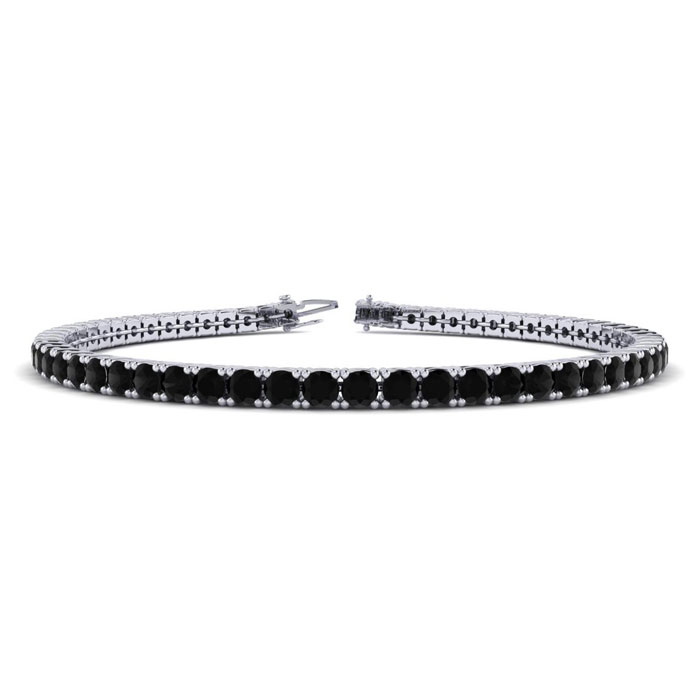 This classic mens diamond bracelet features shimmering black diamonds in I3 clarity. The 6 inch bracelet contains 57 black diamonds at 2.28 carats. The 6.5 inch bracelet contains 62 black diamonds at 2.48 carats. The 7 inch bracelet contains 67 black diamonds at 2.68 carats. The 7.5 inch bracelet contains 72 black diamonds at 2.88 carats. The 8 inch bracelet contains 76 black diamonds at 3.04 carats. The 8.5 inch bracelet contains 81 black diamonds at 3.24 carats. The 9 inch bracelet contains 86 black diamonds at 3.44 carats. This bracelet is approximately 2.25mm wide and is crafted in 14 karat white gold. This bracelet has a secure, box with tongue and safety clasp.