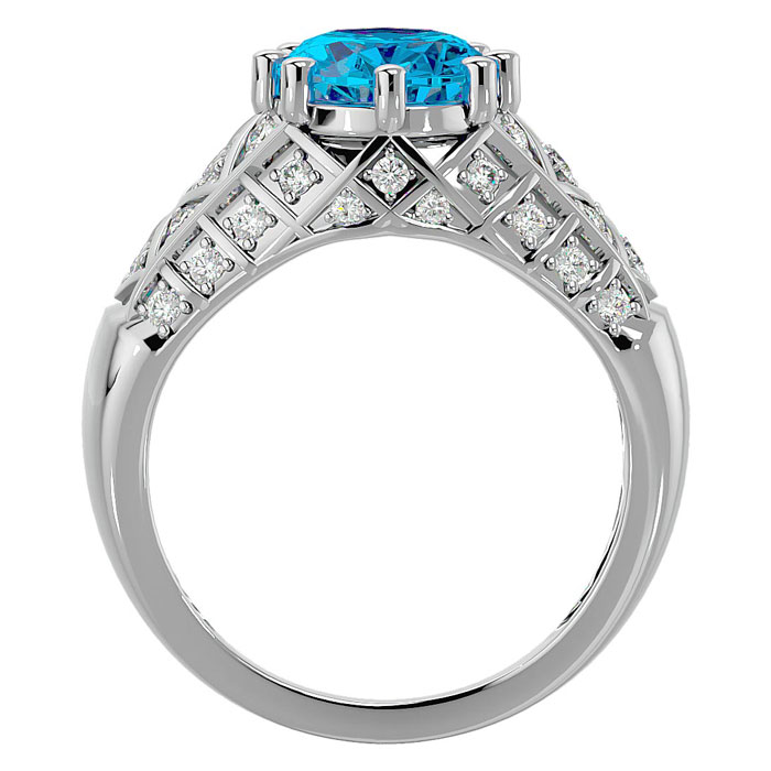 This stunning gemstone and diamond ring features one 10x8mm oval shape blue topaz gemstone at 3.20 carats. It is surrounded by 38 sparkling diamonds in I-J color, I1-I2 clarity at 0.38 carats. Total gem weight is 3.58 carats. This ring is crafted in 10 karat white gold.