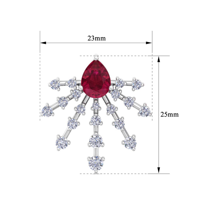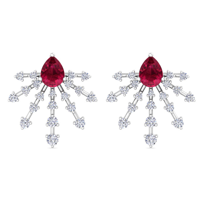These lab grown diamond earrings feature 2 sparkling pear shape ruby gemstones, each weighing 3/4 carat. They are surrounded by 40 round shape lab grown diamonds totaling 2 carats. Total carat weight is 3 1/2 carats. Diamond color is G-H, diamond clarity VS. These earrings are in 14 karat white gold and have comfortable and secure post with friction backs. The earrings drop down 1 inch.