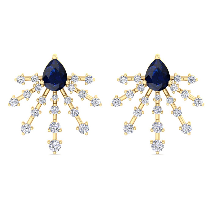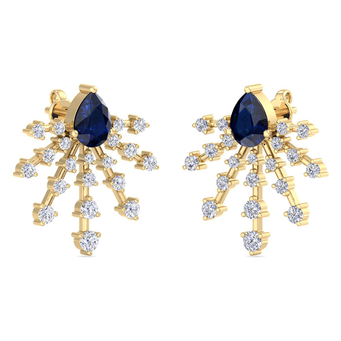 These lab grown diamond earrings feature 2 sparkling pear shape sapphire gemstones, each weighing 3/4 carat. They are surrounded by 40 round shape lab grown diamonds totaling 2 carats. Total carat weight is 3 1/2 carats. Diamond color is G-H, diamond clarity VS. These earrings are in 14 karat yellow gold and have comfortable and secure post with friction backs. The earrings drop down 1 inch.