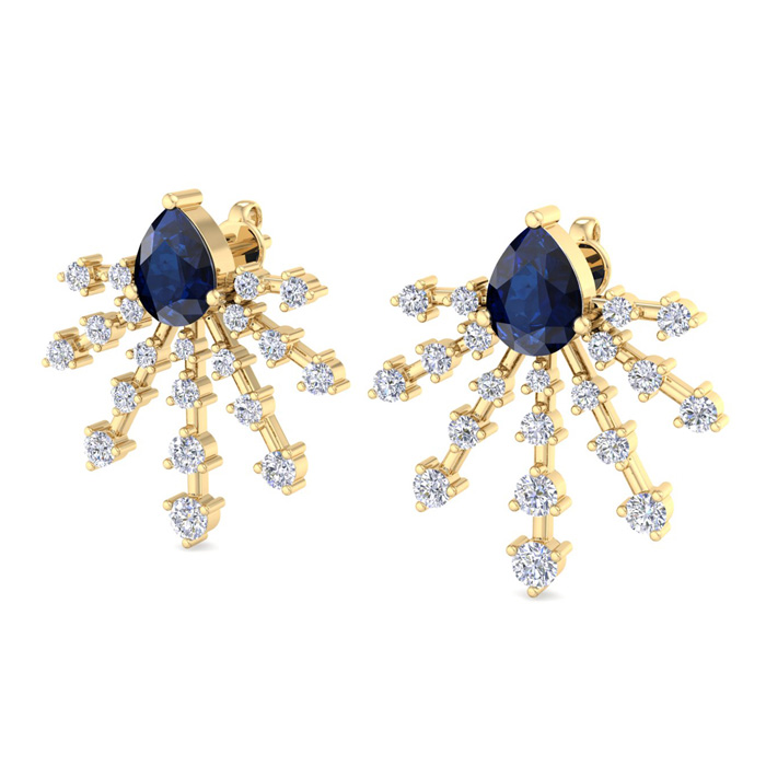 3 1/2 Carat Pear Shape Sapphire and Lab Grown Diamond Spray Drop Earrings In 14 Karat Yellow Gold