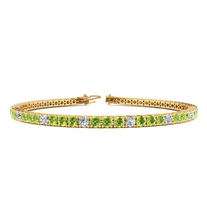 This classic gemstone bracelet features shimmering white diamonds in J-K color, I1-I2 clarity and peridot gemstones. The 6 inch bracelet contains 57 gemstones and diamonds at 2.71 carats. The 6.5 inch bracelet contains 62 gemstones and diamonds at 2.95 carats. The 7 inch bracelet contains 67 gemstones and diamonds at 3.19 carats. The 7.5 inch bracelet contains 72 gemstones and diamonds at 3.42 carats. The 8 inch bracelet contains 76 gemstones and diamonds at 3.61 carats. The 8.5 inch bracelet contains 81 gemstones and diamonds at 3.85 carats. The 9 inch bracelet contains 86 gemstones and diamonds at 4.09 carats. This bracelet is approximately 2.25mm wide and is crafted in 14 karat yellow gold. This bracelet has a secure, box with tongue and safety clasp.