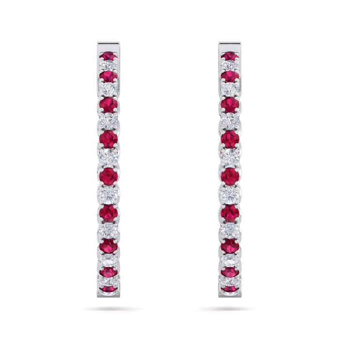 3 1/2 Carat Ruby and Diamond Hoop Earrings In 14 Karat White Gold, 1 Inch