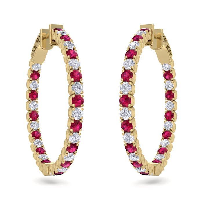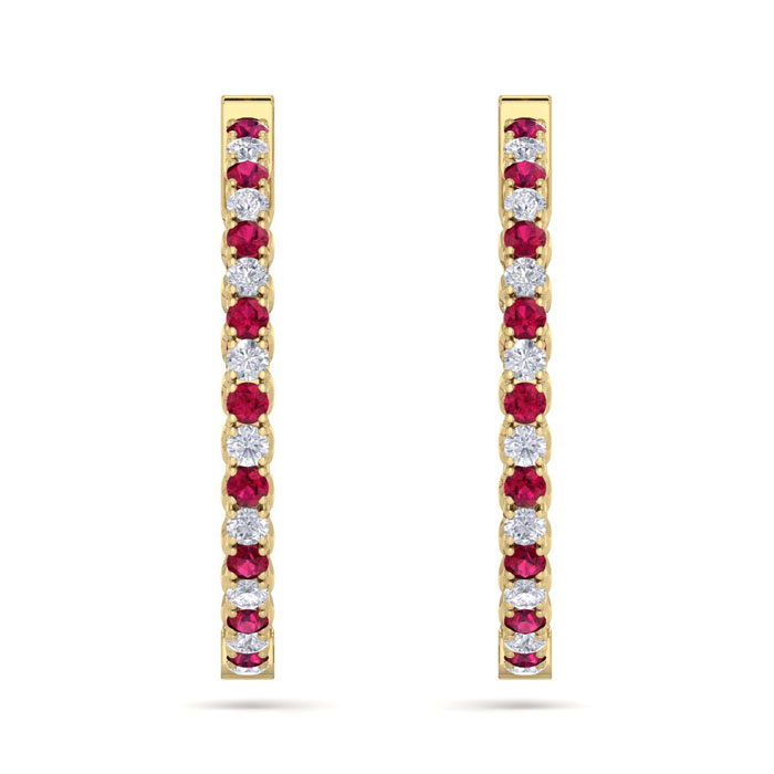 3 1/2 Carat Ruby and Diamond Hoop Earrings In 14 Karat Yellow Gold, 1 Inch