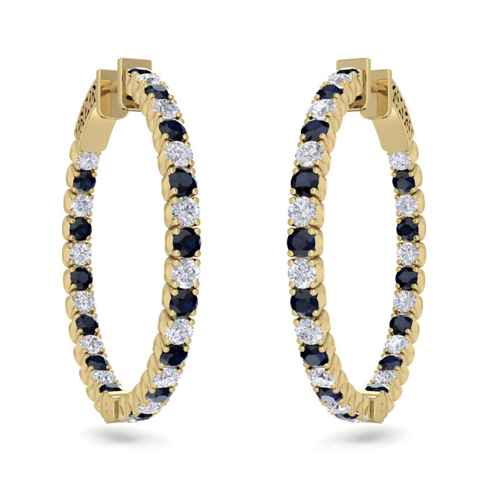 These classic hoop earrings feature 30 sparkling diamonds in J-K color, I2-I3 clarity and 30 sapphire gemstones. Total carat weight is 3 1/2 carats. These earrings are in 14 karat yellow gold and have secure hidden snap backs. These earrings are 1 inch in diameter.