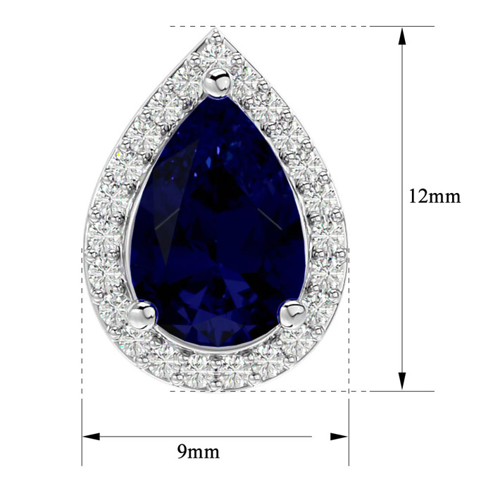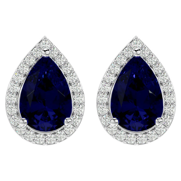 These elegant gemstone earrings feature two 9x6mm pear shape sapphire gemstones at approximately 3.20 carats. They are surrounded by 48 sparkling diamonds in I-J color, I1-I2 clarity at 1/4 carat total weight. Total gem weight is approximately 3 1/2 carats. These earrings are in 14 karat white gold and have comfortable and secure friction backs.