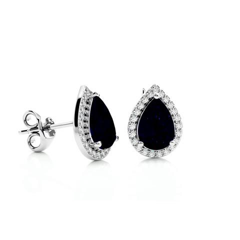 These elegant gemstone earrings feature two 9x6mm pear shape sapphire gemstones at approximately 3.20 carats. They are surrounded by 48 sparkling diamonds in I-J color, I1-I2 clarity at 1/4 carat total weight. Total gem weight is approximately 3 1/2 carats. These earrings are in 14 karat white gold and have comfortable and secure friction backs.