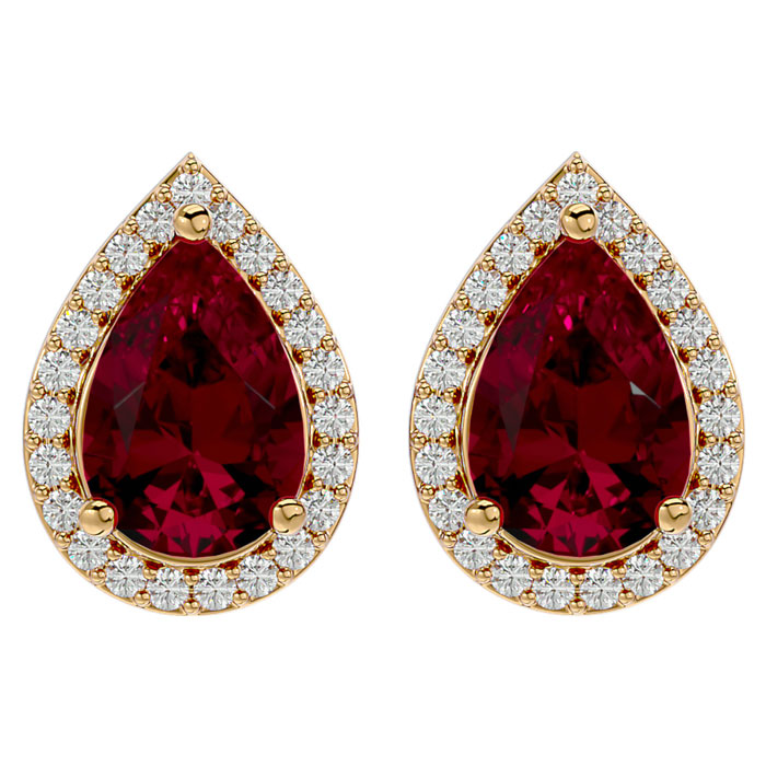 Retrograde Birthstones™ 3 1/3 Carat Ruby and Diamond Pear Shape Stud Earrings In 14 Karat Yellow Gold