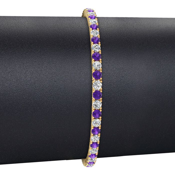 This classic gemstone bracelet features shimmering white diamonds in J-K color, I1-I2 clarity and amethyst gemstones. The 6 inch bracelet contains 57 gemstones and diamonds at 2.56 carats. The 6.5 inch bracelet contains 62 gemstones and diamonds at 2.79 carats. The 7 inch bracelet contains 67 gemstones and diamonds at 3.01 carats. The 7.5 inch bracelet contains 72 gemstones and diamonds at 3.24 carats. The 8 inch bracelet contains 76 gemstones and diamonds at 3.42 carats. The 8.5 inch bracelet contains 81 gemstones and diamonds at 3.64 carats. The 9 inch bracelet contains 86 gemstones and diamonds at 3.87 carats. This bracelet is approximately 2.25mm wide and is crafted in 14 karat yellow gold. This bracelet has a secure, box with tongue and safety clasp.