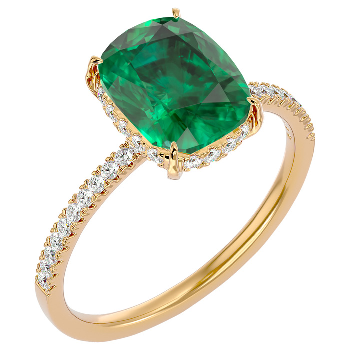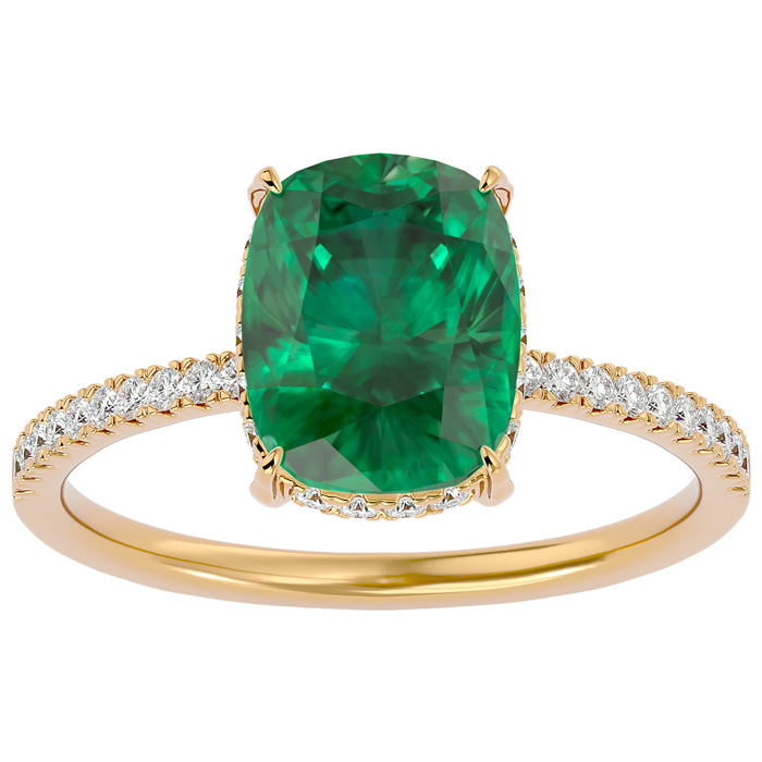 3 1/4 Carat Antique Cushion Shape Emerald and Hidden Halo Diamond Ring In 14 Karat Yellow Gold