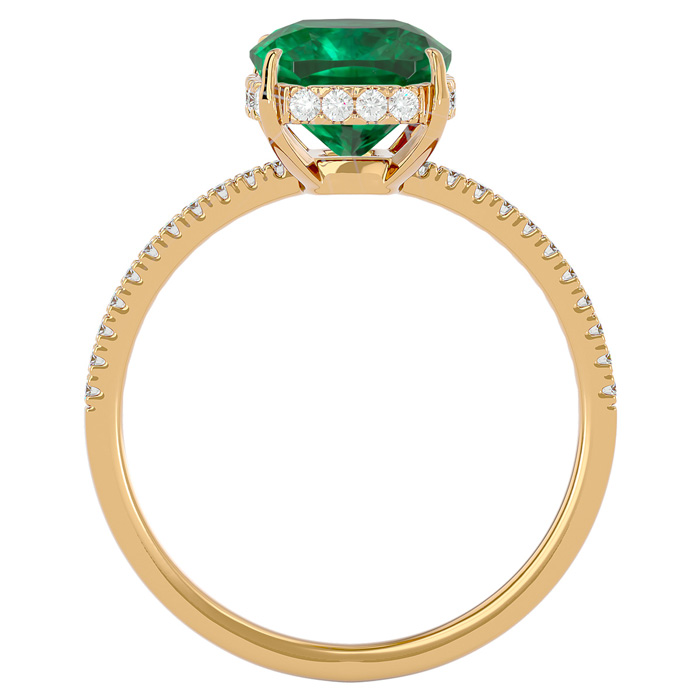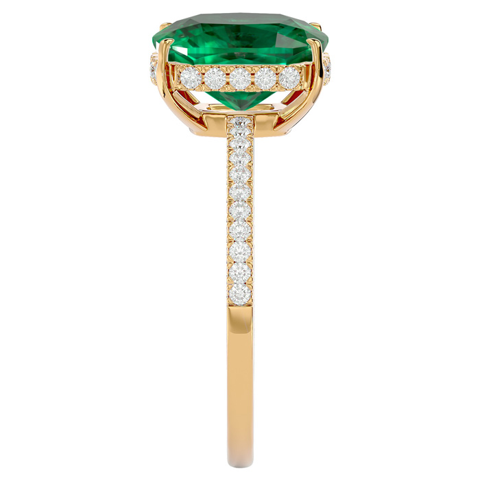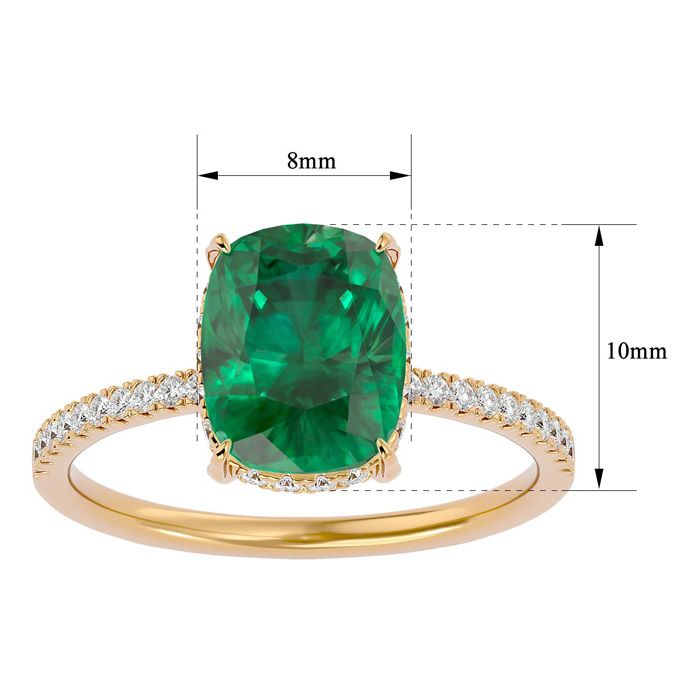 This elegant gemstone ring features one 10x8mm antique cushion shape emerald gemstone at approximately 3 carats. It is surrounded by 32 sparkling diamonds in I-J color, I1-I2 clarity at 1/4 carat total weight. Total gem weight is approximately 3 1/4 carats. This ring is in 14 karat yellow gold.