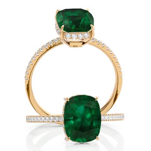 3 1/4 Carat Antique Cushion Shape Emerald and Hidden Halo Diamond Ring In 14 Karat Yellow Gold