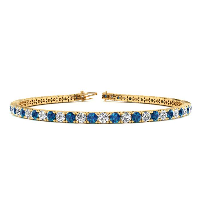 This classic gemstone bracelet features shimmering white diamonds in J-K color, I1-I2 clarity and blue diamonds in I3 clarity. The 6 inch bracelet contains 57 blue and white diamonds at 2.28 carats. The 6.5 inch bracelet contains 62 blue and white diamonds at 2.48 carats. The 7 inch bracelet contains 67 blue and white diamonds at 2.68 carats. The 7.5 inch bracelet contains 72 blue and white diamonds at 2.88 carats. The 8 inch bracelet contains 76 blue and white diamonds at 3.04 carats. The 8.5 inch bracelet contains 81 blue and white diamonds at 3.24 carats. The 9 inch bracelet contains 86 blue and white diamonds at 3.44 carats. This bracelet is approximately 2.25mm wide and is crafted in 14 karat yellow gold. This bracelet has a secure, box with tongue and safety clasp.