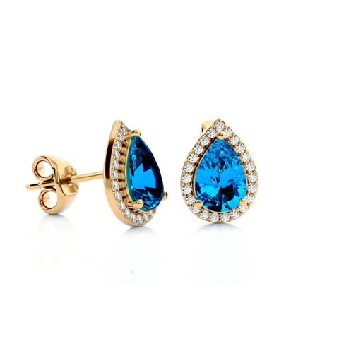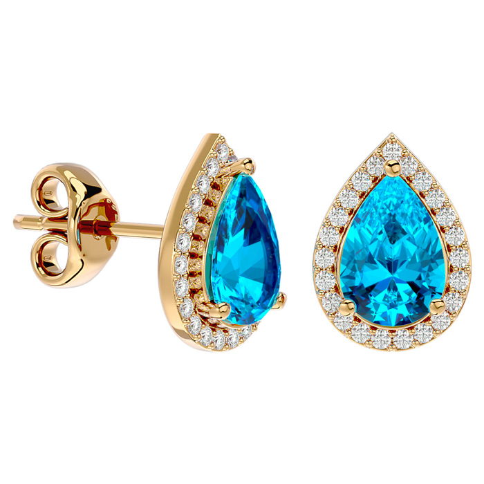 These elegant gemstone earrings feature two 9x6mm pear shape blue topaz gemstones at approximately 3 carats. They are surrounded by 48 sparkling diamonds in I-J color, I1-I2 clarity at 1/4 carat total weight. Total gem weight is approximately 3 1/4 carats. These earrings are in 14 karat yellow gold and have comfortable and secure friction backs.