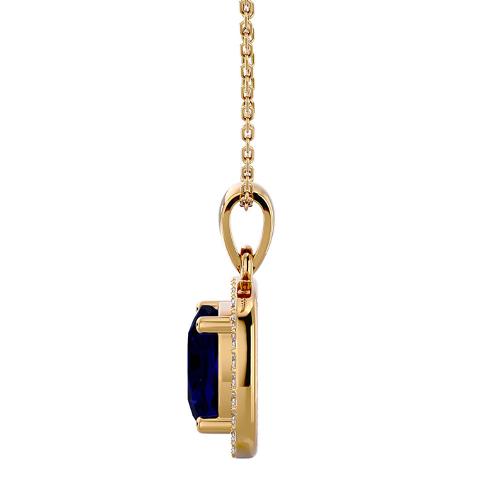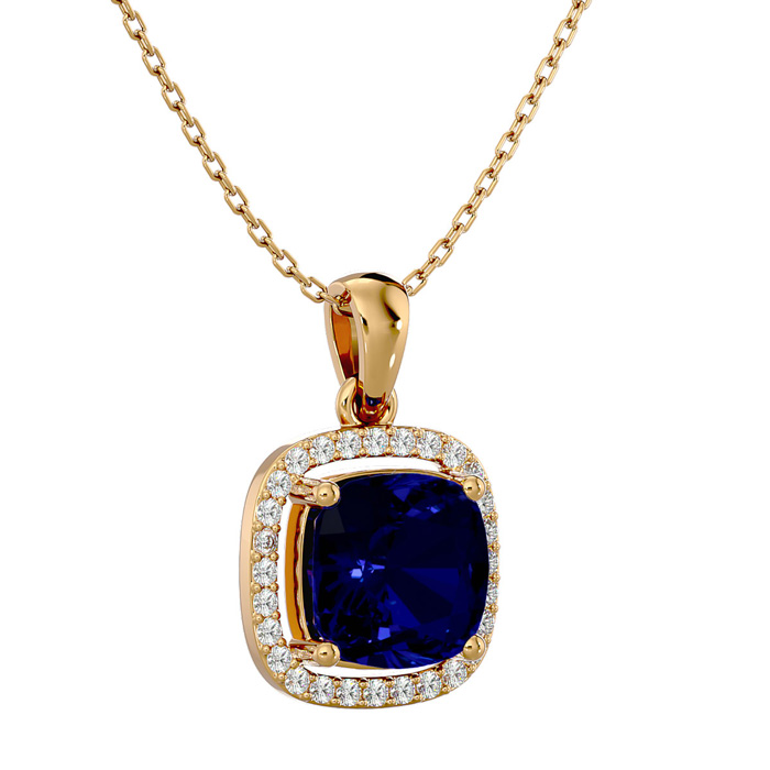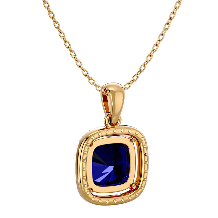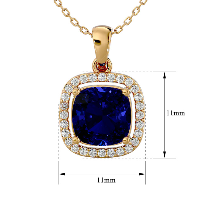 3 1/4 Carat Cushion Cut Sapphire and Halo Diamond Necklace In 14 Karat Yellow Gold, 18 Inches