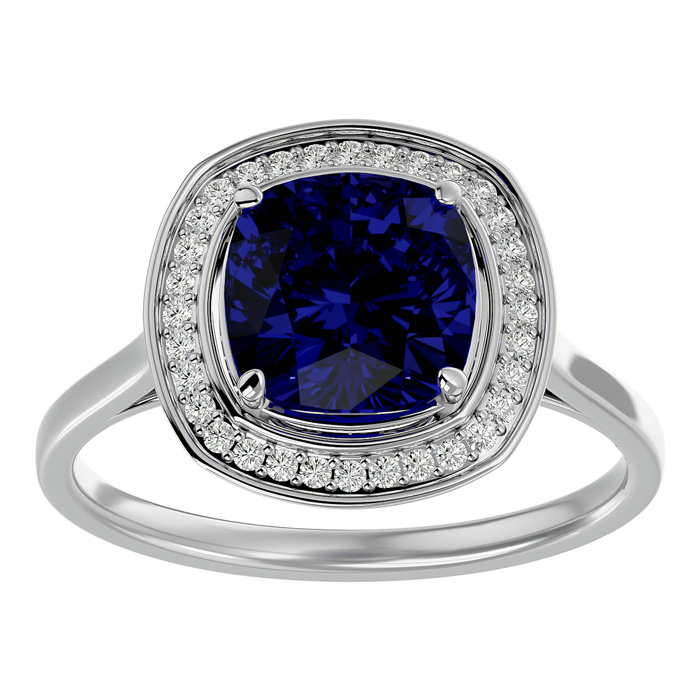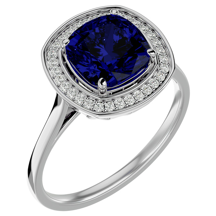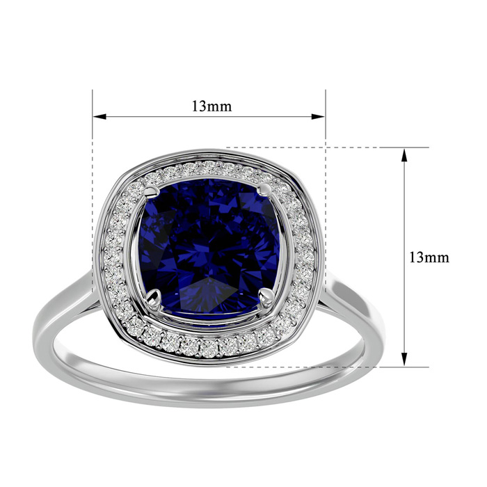This stunning gemstone and diamond ring features one 8x8mm cushion cut sapphire gemstone at 3.10 carats. It is surrounded by 32 sparkling diamonds in I-J color, I1-I2 clarity at 0.16 carats. Total gem weight is approximately 3 1/4 carats. This ring is crafted in 14 karat white gold.
