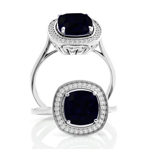 This stunning gemstone and diamond ring features one 8x8mm cushion cut sapphire gemstone at 3.10 carats. It is surrounded by 32 sparkling diamonds in I-J color, I1-I2 clarity at 0.16 carats. Total gem weight is approximately 3 1/4 carats. This ring is crafted in 14 karat white gold.