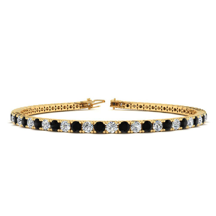 This classic mens diamond bracelet features shimmering white diamonds in J-K color, I1-I2 clarity and black diamonds in I3 clarity. The 6 inch bracelet contains 57 black and white diamonds at 2.28 carats. The 6.5 inch bracelet contains 62 black and white diamonds at 2.48 carats. The 7 inch bracelet contains 67 black and white diamonds at 2.68 carats. The 7.5 inch bracelet contains 72 black and white diamonds at 2.88 carats. The 8 inch bracelet contains 76 black and white diamonds at 3.04 carats. The 8.5 inch bracelet contains 81 black and white diamonds at 3.24 carats. The 9 inch bracelet contains 86 black and white diamonds at 3.44 carats. This bracelet is approximately 2.25mm wide and is crafted in 14 karat yellow gold. This bracelet has a secure, box with tongue and safety clasp.