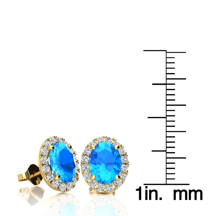 3 1/4 Carat Oval Shape Blue Topaz and Halo Diamond Stud Earrings In 14 Karat Yellow Gold
