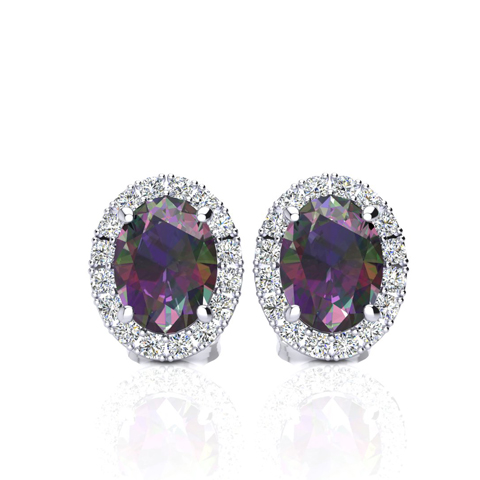 These stunning gemstone and halo diamond earrings feature two 8x6mm oval shape mystic topaz gemstones at 3.00 carats. They are surrounded by 40 sparkling diamonds in I-J color, I1-I2 clarity at 0.28 carats. Total gem weight is 3.28 carats. These earrings are crafted in 14 karat white gold and have comfortable and secure post with friction backs.