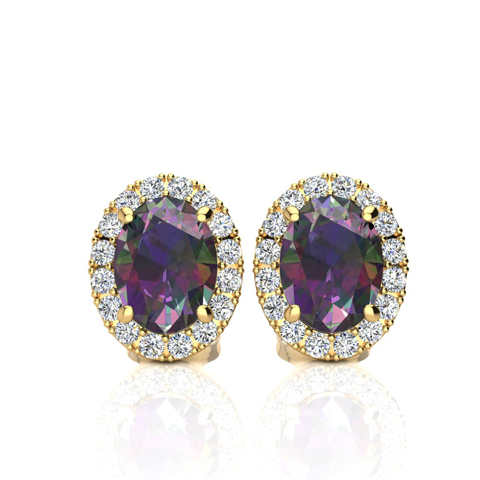 These stunning gemstone and halo diamond earrings feature two 8x6mm oval shape mystic topaz gemstones at 3.00 carats. They are surrounded by 40 sparkling diamonds in I-J color, I1-I2 clarity at 0.28 carats. Total gem weight is 3.28 carats. These earrings are crafted in 14 karat yellow gold and have comfortable and secure post with friction backs.
