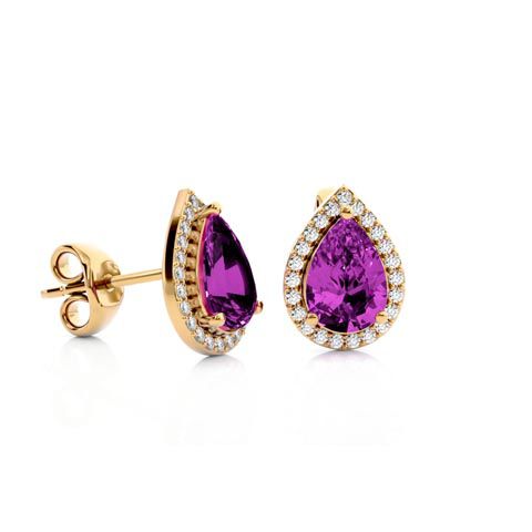 These elegant gemstone earrings feature two 9x6mm pear shape pink topaz gemstones at approximately 3 carats. They are surrounded by 48 sparkling diamonds in I-J color, I1-I2 clarity at 1/4 carat total weight. Total gem weight is approximately 3 1/4 carats. These earrings are in 14 karat yellow gold and have comfortable and secure friction backs.
